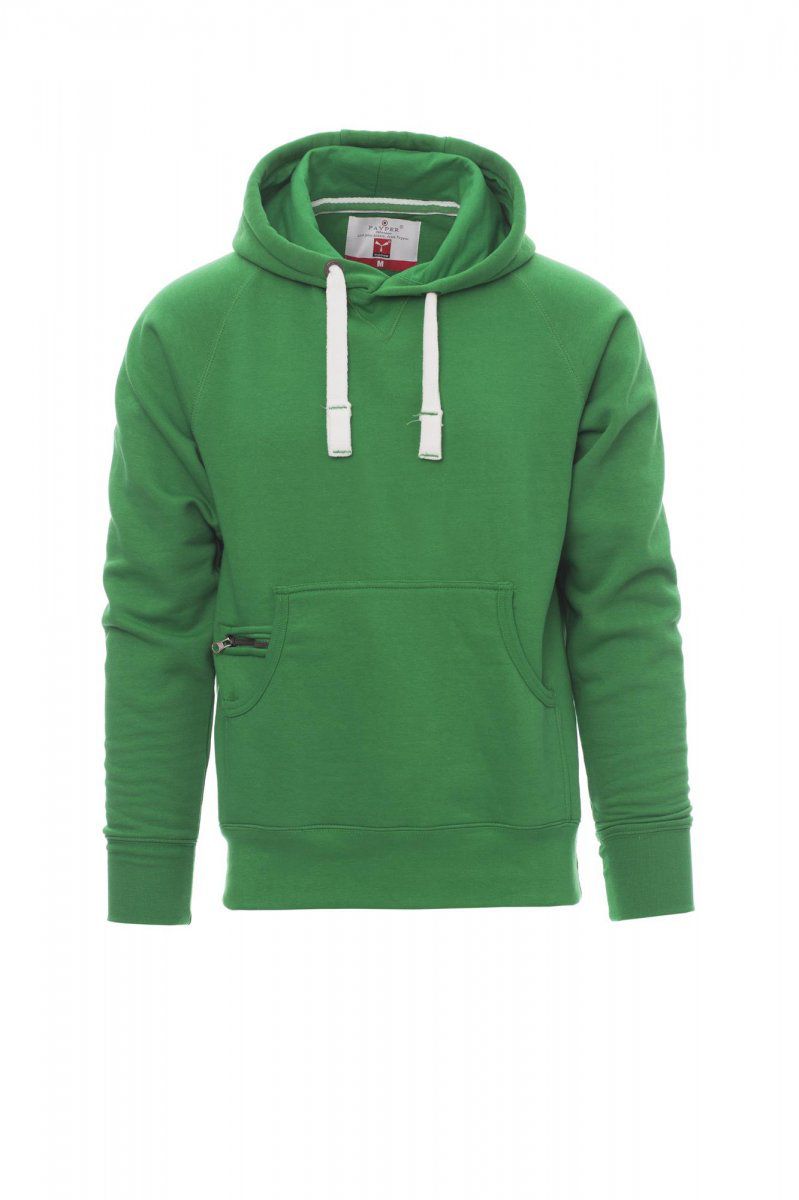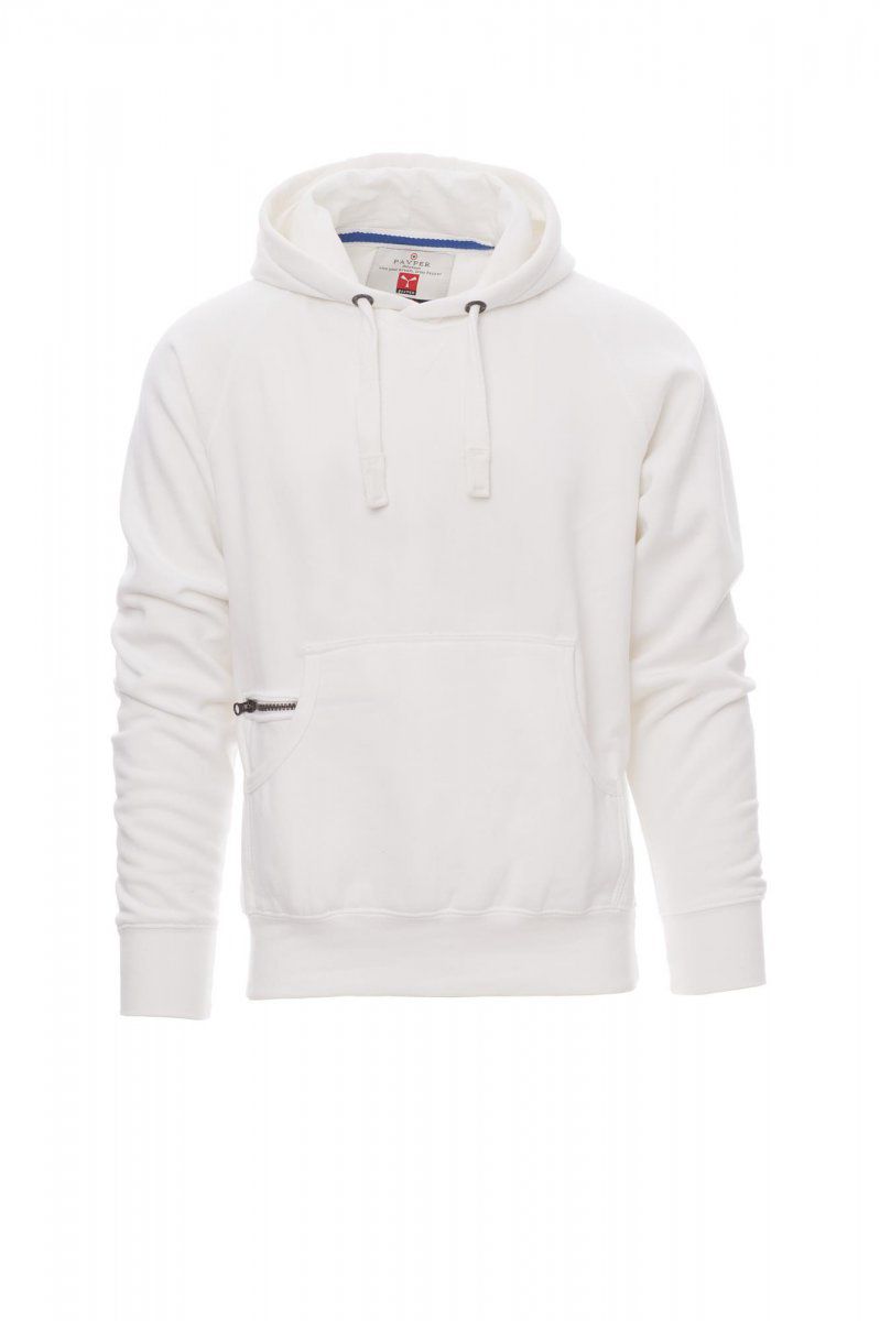 ATLANTA+ Felpa da uomo, cappuccio a due cuciture, coulisse bianca in corda con cuciture in tinta con la felpa e anelle in metallo, manica raglan, cucitura estetica a V al collo, tasche a marsupio, taschino con zip, polsini e vita in costina elasticizzata, cuciture rinforzate. Composizione: 70% COTONE + 30% POLIESTERE Peso: 300 GR/MQ