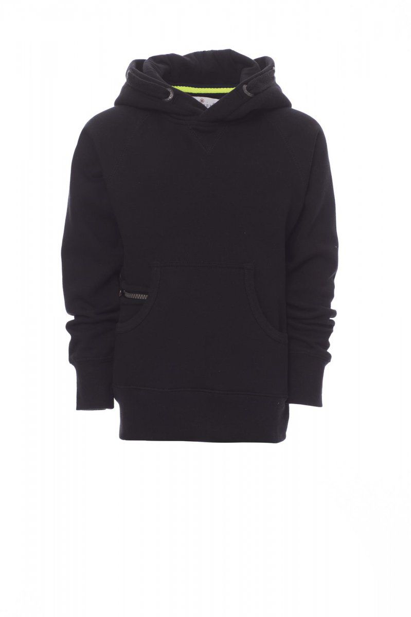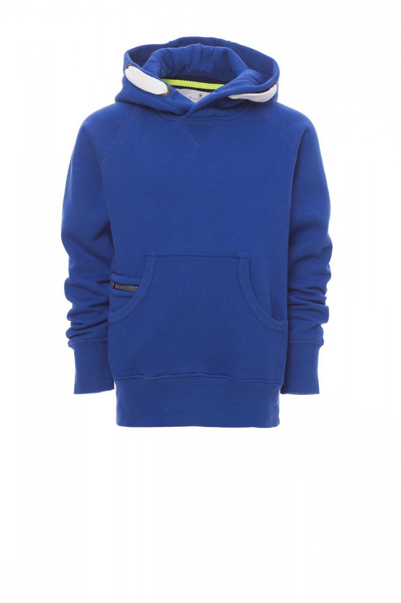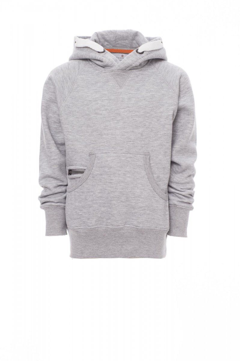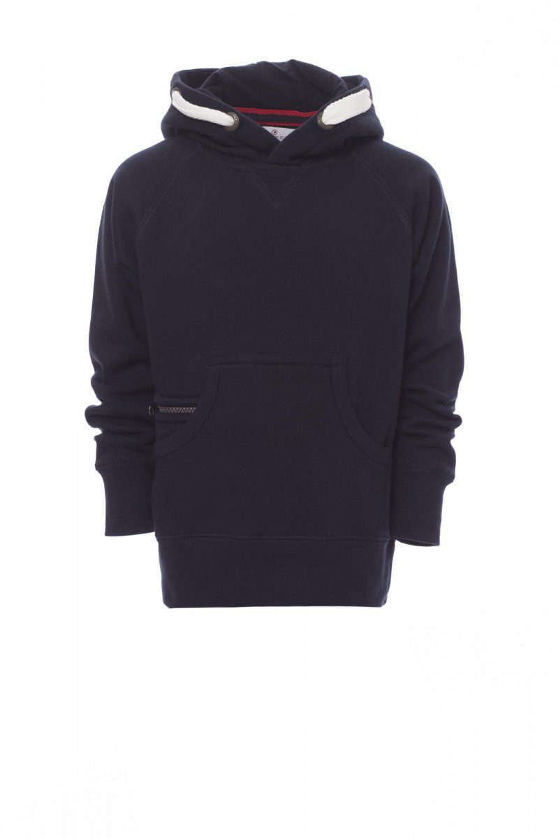 COLORADO+ Felpa da bambino, cappuccio a due cuciture, coulisse bianca in corda con cuciture in tinta con la felpa richiusa con doppie anelle in metallo, manicaraglan, cucitura estetica a V al collo, tasche a marsupio, taschino con zip,polsini e vita in costina elasticizzata, cuciture rinforzate. Composizione: 70% COTONE + 30% POLIESTERE. Peso: 300 GR/MQ.