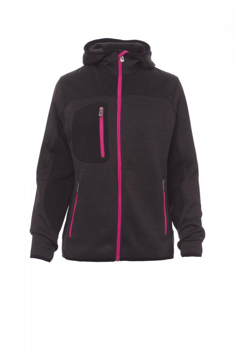 TRIP LADY Giacca ergonomica da donna, zip lunga SBS nastrata, cappuccio sagomato con due cuciture, fine bordino ai polsi e in vita, due tasche laterali con zip, una tasca al petto. Lavorazione a maglia con inserti in sofshell nero. Composizione: 100% POLIESTERE Peso: 300 GR/MQ