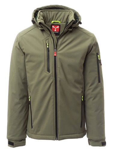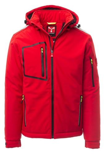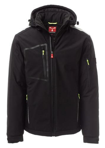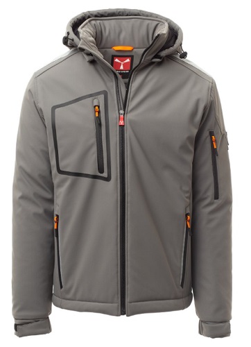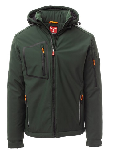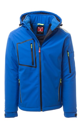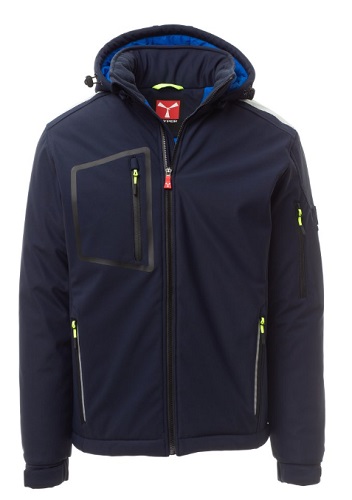 STREAM PAD WP 8000 mm H2O, WVT 5000 g/mІ 24h. Soft-shell imbottito da uomo, chiusura tramite zip SBS con cursore in metallo semi-auto lock e tiretto personalizzato. Cappuccio removibile, con coulisse regolabile. Colletto interno con dettagli laterali in pile. Bande retroriflettente su spalle, fondoschiena e retro cappuccio. Polsini elasticizzati, regolabili con velcroe manicotto interno. Tasca termosaldata sul petto, chiusa con zip spalmata. Due tasche laterali, chiuse con zip dal dettaglio retroriflettente. Tasca sul braccio sinistro con porta penne integrato, chiusa con zip. Tiretti fluorescenti. Due tasche interne, una sagomata con zip sul petto destro e una porta tablet chiusa con velcro. Fondo regolabile con stopper personalizzati. Composizione: 78% NYLON + 22% ELASTAN Aspetto: SOFT-SHELL Peso: 330 GR/MQ