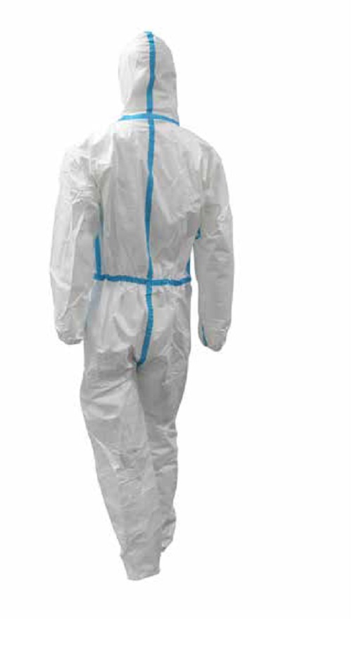 TUTA DI PROTEZIONE MONOUSO IN TESSUTO NON TESSUTO TERMOSALDATO CON NASTRO A CONTRASTO.